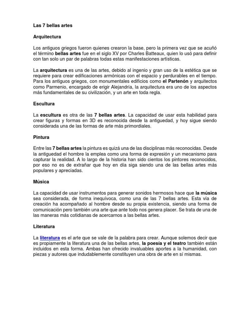 Desde pintura y escultura, pasando por la arquitectura hasta llegar a la música, hemos preparado una lista de las mejores creaciones de las 7 bellas artes que no puedes dejar de ver y oír... Los arquitectos deben pensar no solo en la belleza, sino también en la utilidad de sus estructuras. Hola informes hoy hablaremos sobre la arquitectura, sean curiosos y arrivederchi El estilo beaux arts se desarrolló en las últimas décadas del.. 16.01.2017 · cuáles son las 7 bellas artes.